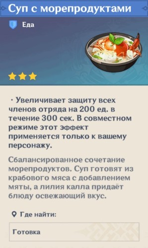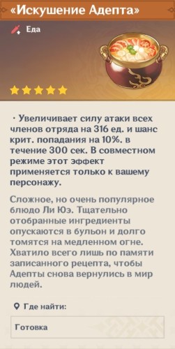 Силу атаки и шанс крита могут повысить Искушение адепта, Налетайка, Миндальный тофу. На защиту и прочность щита влияют Лунный пирог, Суп с морепродуктами и Тэмпура с сакурой. Действия блюд одного типа так же не складываются.