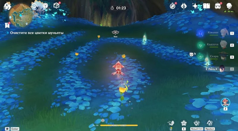 Последняя головоломка с цветками в Оазисе Вурукаша находится чуть севернее предыдущей, и она имеет ограничение по времени – 1 минута 30 секунд. Распустить бутоны за это время не особенно сложно, особенно если предварительно изучить порядок их появления на нашей схеме. После завершения первой цветочной дорожки потребуется облететь дерево, следуя за появившимися зелеными лепестками. Затем появятся дополнительные цветы в нижней части узора, сбор которых и завершит последнюю загадку цветков шуньяты.