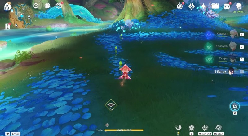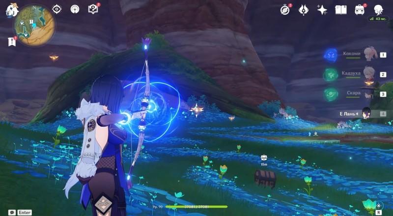 К следующей головоломке с цветками можно просто добежать от предыдущей, а можно переместиться к статуе архонта возле оазиса и спуститься по тропинке. Расположенная прямо посреди тропы полянка предлагает почти аналогичную загадку для решения, но теперь вы начинаете с дальнего края кольца, постепенно закручиваясь вместе с ведущими вас бутонами к центру узора.