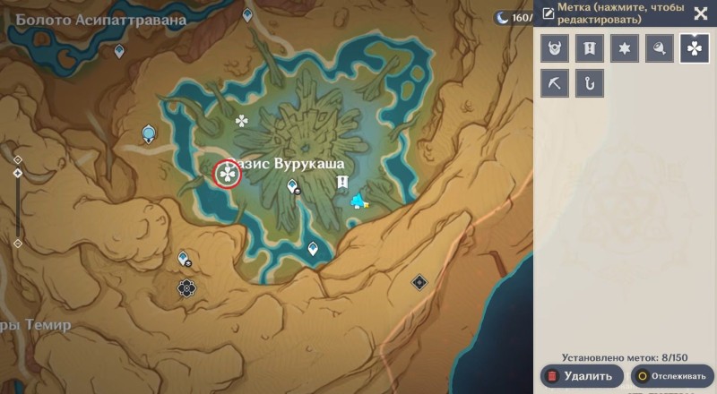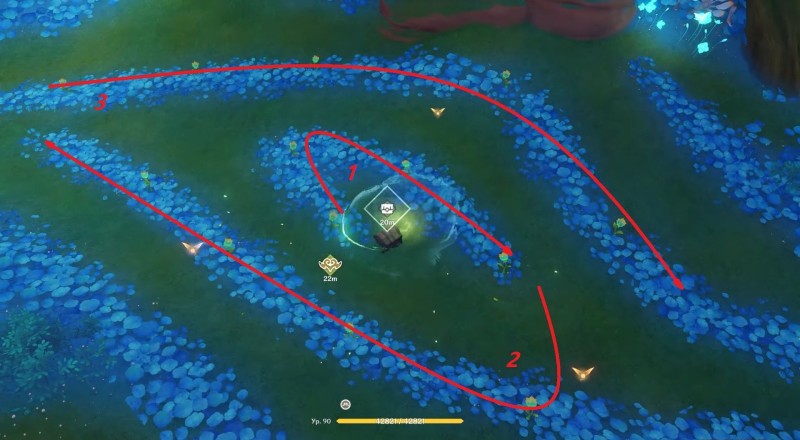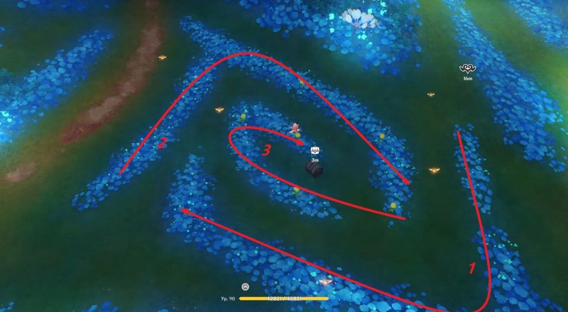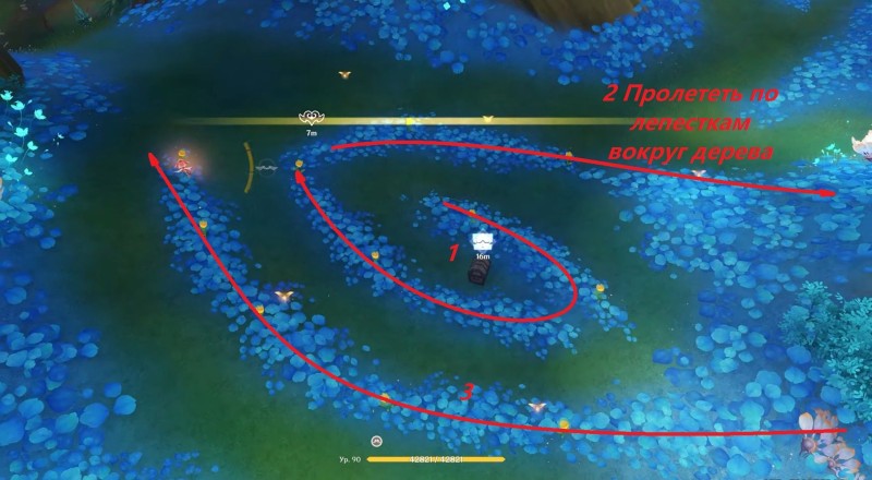 Одна из загадок с цветками отмечена на карте под оазисом Вурукаша и находится ближе к краю локации, неподалеку от подземелья. Начните раскрывать бутоны с четырех цветков в центре, затем соберите появившиеся лепестки и продолжайте лететь вдоль цветочных дорожек. Порядок появления новых цветов мы отразили на схеме выше.