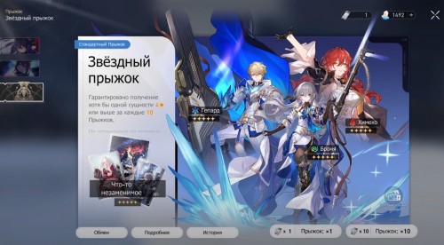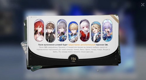 На постоянной основе доступен всем игрокам в любой момент времени. Мы советуем вам потратить на нее ровно 300 круток, причем сделать это желательно в начале игры. Дело в том, что после выполнения указанного числа прыжков вы сможете совершенно бесплатно забрать любого легендарного персонажа из списка: Клару, Химеко, Вельта, Броню, Гепарда, Байлу или Яньцин.