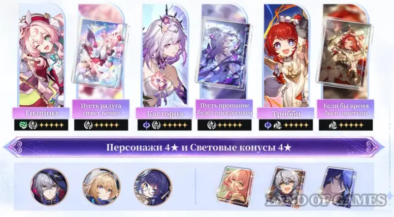 - 5-звездочные персонажи (повышенный шанс выпадения): Гиацина (Память: Ветряной), Кастория (Память: Квантовый) и Трибби (Гармония: Квантовый)