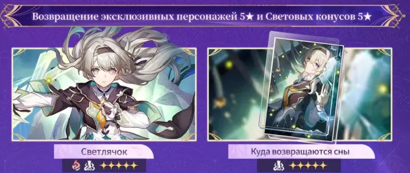 - 5-звездочные персонажи (повышенный шанс выпадения): Светлячок (Разрушение: Огненный)