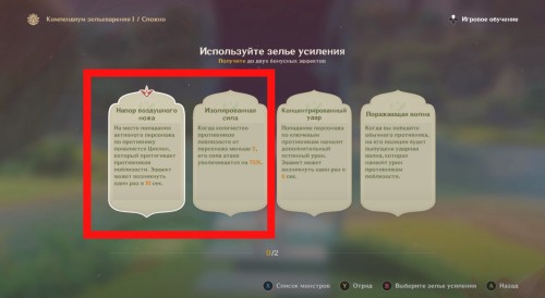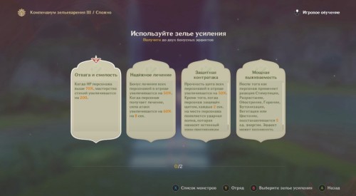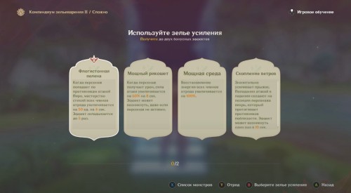 Из зелий усиления мы рекомендуем взять «Отвагу и смелость» и «Мощную выживаемость», чтобы повысить эффективность создаваемых Дендро реакций и быстрее уничтожать вражеские группы.