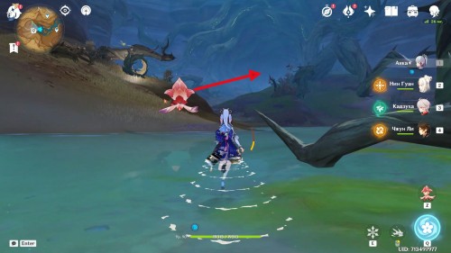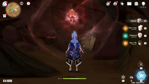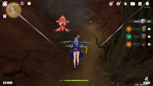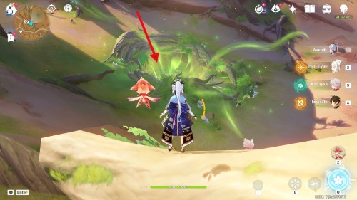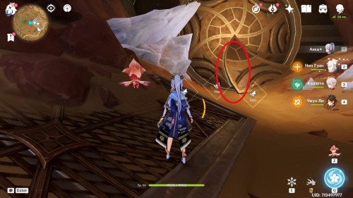 На северо-востоке пещеры находится проход, закрытый золотым барьером – печатью амриты. Преграду можно убрать при помощи Соруш. Экипируйте ее и войдите в состояние Пари, после чего подлетите к барьеру и зажмите кнопку элементального навыка. Под воздействием силы Пари барьер развеется, и вы сможете пройти дальше.