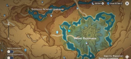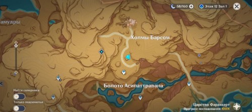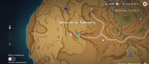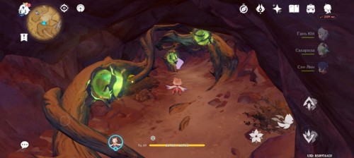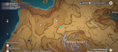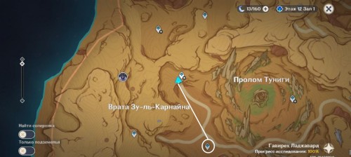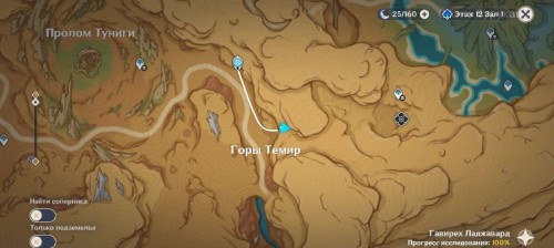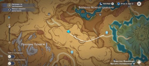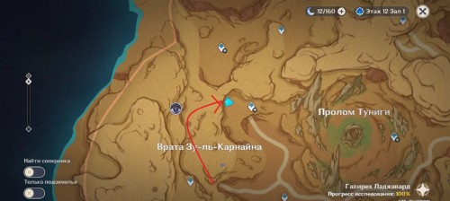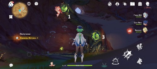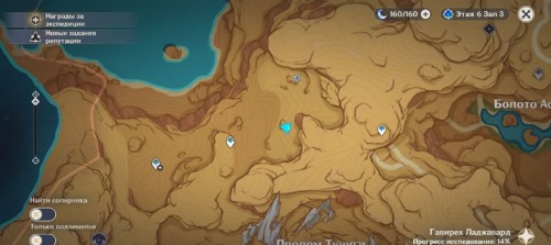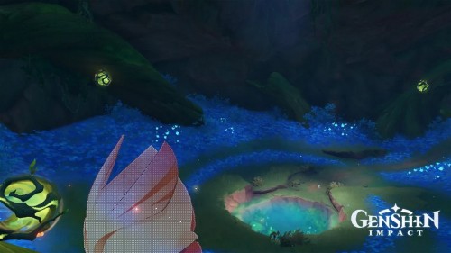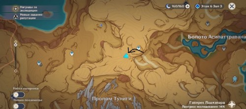 Переместитесь к Статуе Архонтов и пройдите на запад, поднявшись на другую скалу с помощью четырехлистного символа. У лагеря хиличурлов сверните направо и спуститесь в небольшой проход.