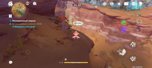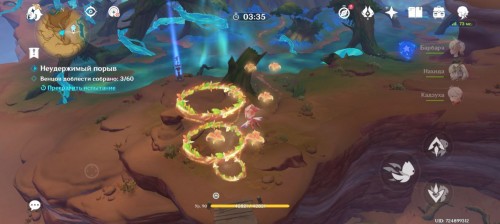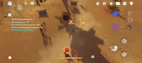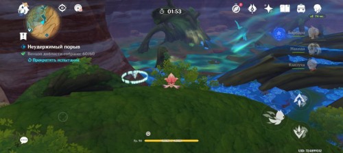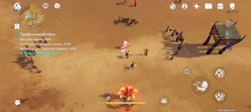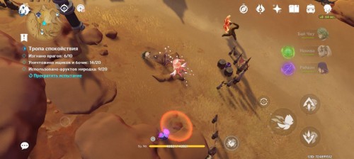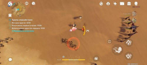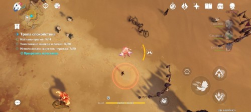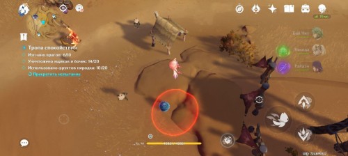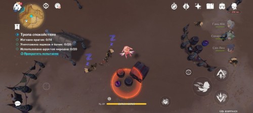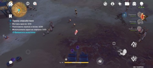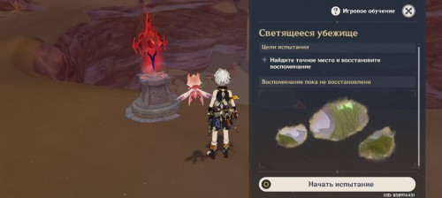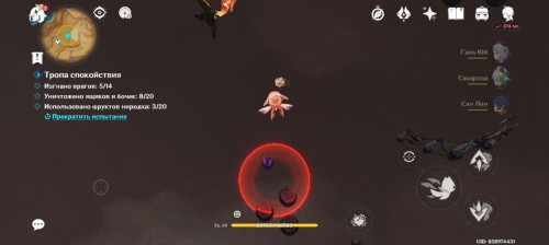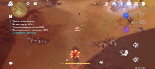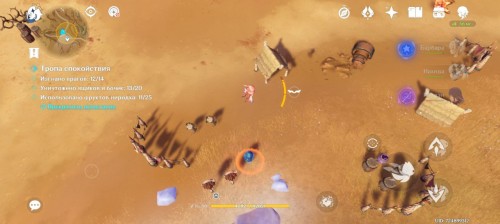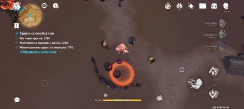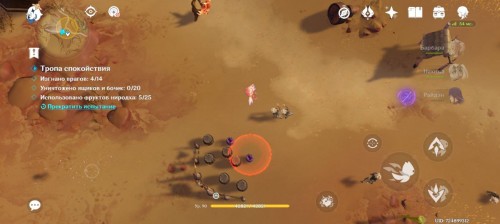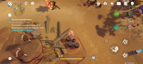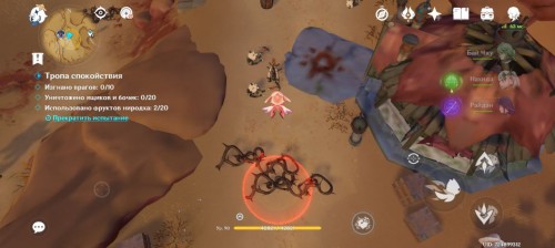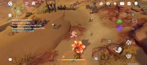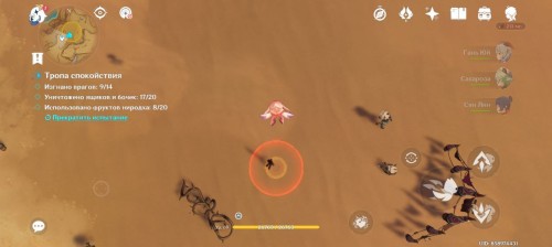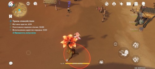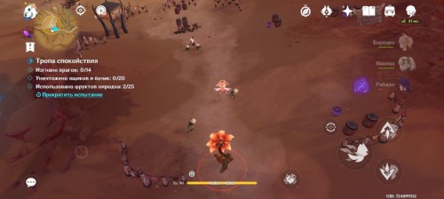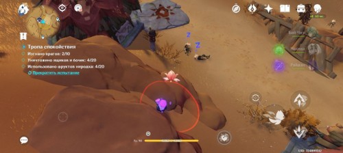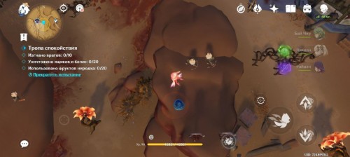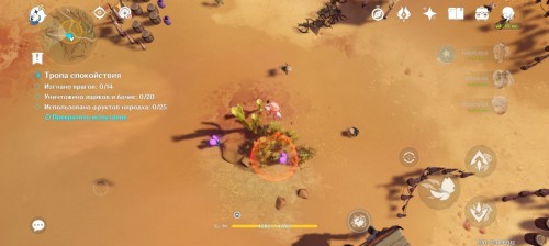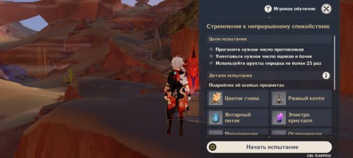 Это первое испытание вида «Тропа спокойствия». Здесь, играя за Соруш, вам предстоит прогнать всех хиличурлов, используя фрукты ниродха и предметы поблизости. Перед началом испытания вы можете ознакомиться с особенностями всех объектов и монстров, а также с целями: