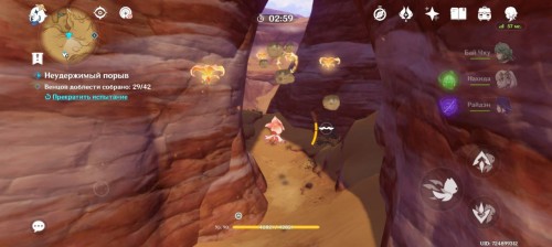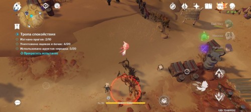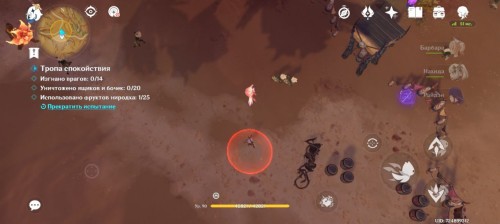 В этой локации можно выделить верхнюю и нижнюю дороги. Сначала пролетите на середину и намочите двух хиличурлов, сбросив фрукт ниродха на Гидро янтарь. Они убегут на верхнюю дорогу. Здесь же, только чуть ниже, подорвите несколько бочек для достижения второй цели.