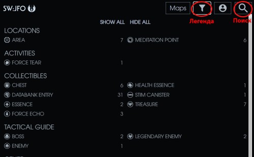 Пользоваться представленной выше картой крайне просто. По умолчанию на ней демонстрируется Корусант. Если же вам требуется какая-то другая планета, то нажмите на кнопку «Maps» в правом верхнем углу, а затем выберите нужный вам регион.