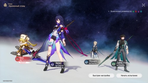 Яньцин (замена DPS) | Лед не относится к рекомендуемым элементам для данного испытания, однако речь идет об единственном бойце, направленным на уничтожение одиночных целей и обладающим китом, базирующимся на критах. Поэтому он может извлечь немалую пользу из баффов данного матча. |