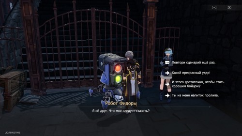 После передачи языкового модуля советуем вам телепортироваться в другую локацию и возвратиться обратно. Вы увидите, что Фидора починила своего робота, поэтому вы сможете поговорить с ним. Он захочет, чтобы вы обучили его социальным навыкам.