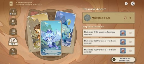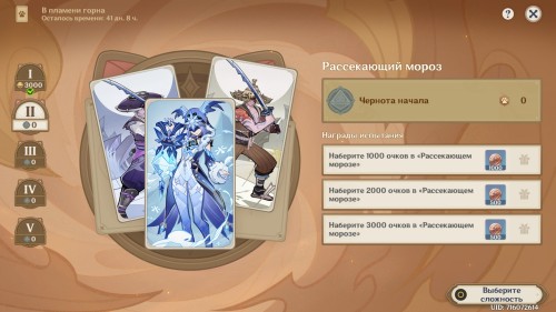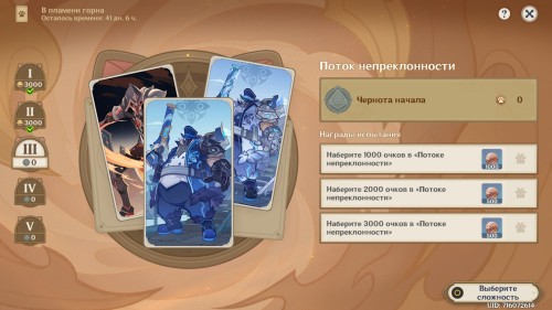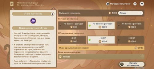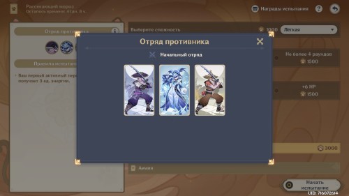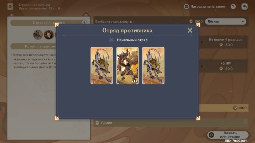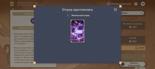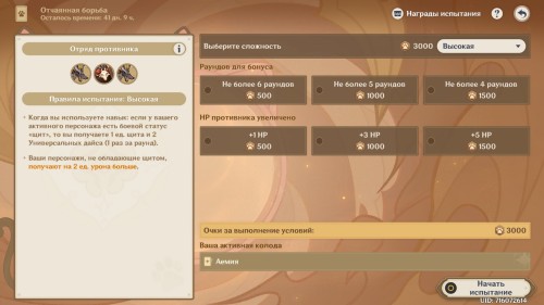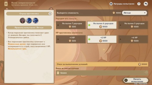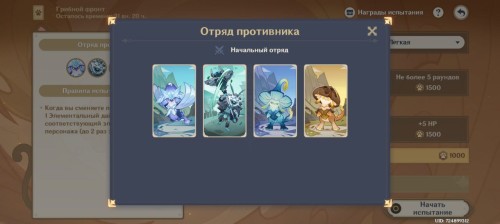 Условия испытания подталкивают вас чаще менять карты героев, чтобы получать дополнительные дайсы. В связи с этим лучше создавать отряд из персонажей, кому не нужно долго находиться на поле – например, герои с помощниками или те, у кого взрыв стихий действует при смене персонажа. Хорошая идея – любой отряд с Моной; ее карта позволяет раз за раунд сменить героя в качестве быстрого действия, что для вас крайне выгодно.