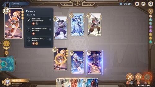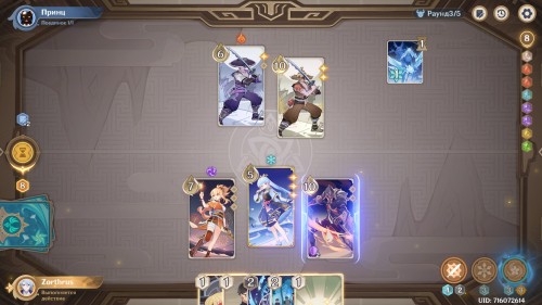Маг Крио цицинов способна призывать помощника на поле боя, поэтому рекомендуем взять карту Последний путь, при помощи которой вы сможете быстренько изгнать его. Уже в самом начале ваш активный персонаж получит 3 единицы энергии, что позволит вам уже в первом ходе выполнить взрыв стихии. Так что рекомендуем выбрать героя, чья ульта может принести наибольшую пользу (например, вы можете использовать взрыв Еимии, а затем сразу же переключиться на Аяку, чтобы на протяжении трех ходов вызывать Таяние).