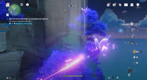 Взаимодействуйте с маркером испытания для создания громовых сфер, а затем призовите электрогранум с помощью расположенной рядом ветви громовой сакуры и взлетите вверх. Доберитесь до контрольной точки и при необходимости вызовите еще один электрогранум (мы советуем обновлять его при любой возможности, так как он может истечь в самый неподходящий момент времени).