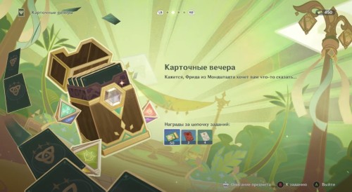 Первым делом вам нужно будет пройти квест «Дуэль начинается! Первые подозрения»», позволяющий получить доступ ко всем испытаниям главного ивента. Далее необходимо взяться за выполнение миссии «Карточные вечера». Вам предстоит просто поговорить с Фридой в Мондштадте. В награду за выполнение задания вы получите 4 опыта искателя приключений, 4 опыта странника и 50 купонов призыва.