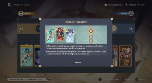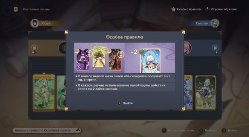 На скриншотах выше демонстрируются карты оппонента и особые правила, которые действуют в рамках данного испытания. В колоде противника присутствуют сразу два довольно мощных персонажа (Ху Тао и Сяо).