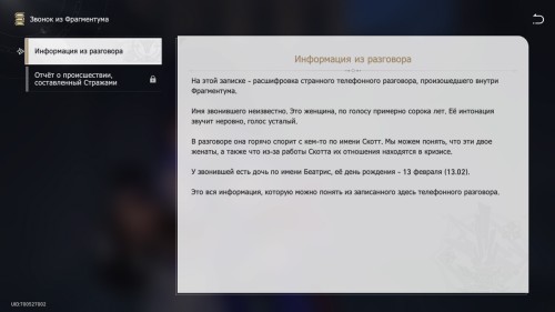 Снова взаимодействуйте с будкой. Вы услышите звонок. Обязательно ответьте на него. С вами свяжется незнакомая женщина. Поговорите с ней. Можете выбирать любые ответы, так как это ни на что не влияет. Собеседница назовет дату 13 февраля – запомните ее. Вы получите 20 щитов после завершения диалога и запись «Звонок из Фрагментума», в котором даны подсказки о том, что делать дальше.