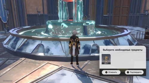 Телепортируйтесь к указанному якорю, а затем развернитесь и подойдите к фонтану. Далее вы можете потратить накопленную похвалу высокой морали, чтобы выловить из фонтана различные сокровища: твердая вода х3, мусор х3, древняя монета х1, угасшее ядро х1 и хлебная содовая Джима Роджера х1. Кроме того, вы разблокируете ачивку под названием «Большой куш».