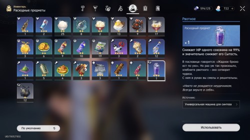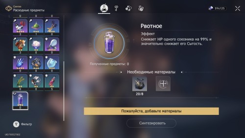 Теперь создайте этот напиток с помощью Синтеза, потратив 8 единиц Мусора и любой материал. Откройте инвентарь, перейдите в категорию «Расходные предметы», найдите Рвотное и используйте его на любом из ваших персонажей. В итоге вы получите нужную ачивку.