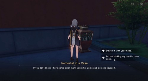 Затем ударьте по вазе один раз, чтобы начать разговор с Бессмертным. Можете выбирать любые варианты ответов, так как незнакомец в конце все равно попросит вас принести ему 5 мешков Мусора. Снова взаимодействуйте с сосудом и передайте персонажу отходы, выбрав опцию «Поместить предметы внутрь»