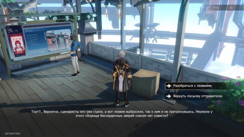 От предыдущей посылки пройдите немного на юго-восток, и там вы обнаружите еще одну коробку для доставки. Взаимодействуйте с ней, а потом выберите следующие ответы: