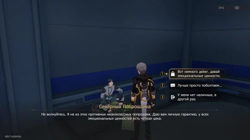 Поднимитесь по ступенькам и заговорите с Северным попрошайкой. После нескольких фраз выберите ответ «Вот немного денег...»
