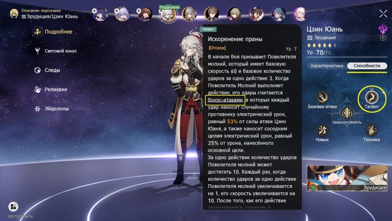 - Цинцюэ – появляется после открытия 4-го Эйдолона «Удачная комбинация, последняя кость»: использовав навык, Цинцюэ имеет 24% вероятности получить состояние Независимость до конца хода, а вместе с ним, при проведении обычной или усиленной базовых атак, выполняет бонусное нападение квантовым уроном. Сила урона бонус-атаки равняется 100% от силы предыдущего действия.