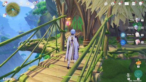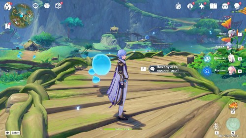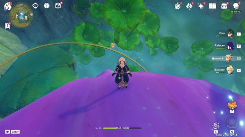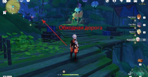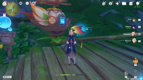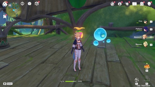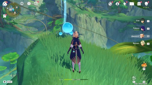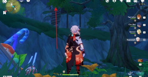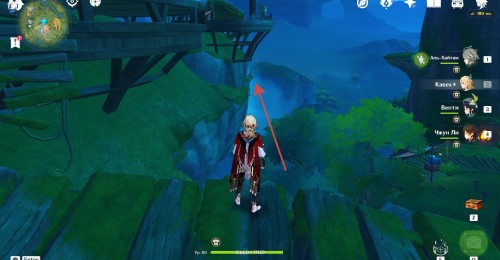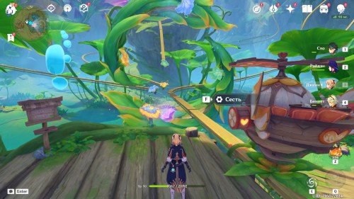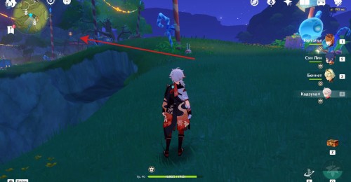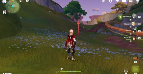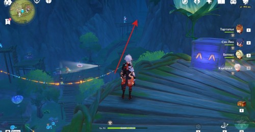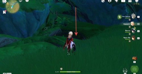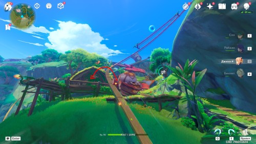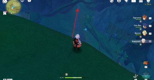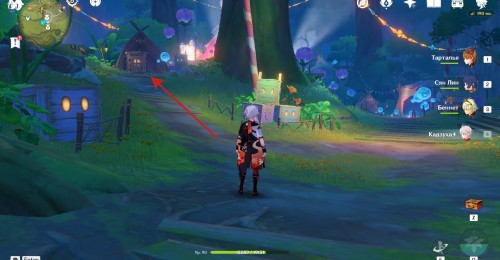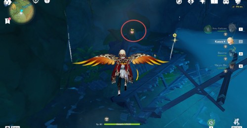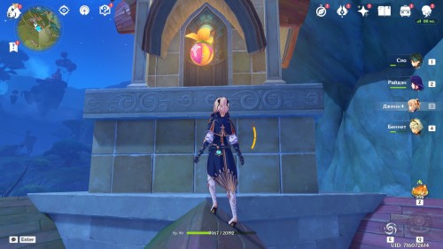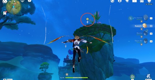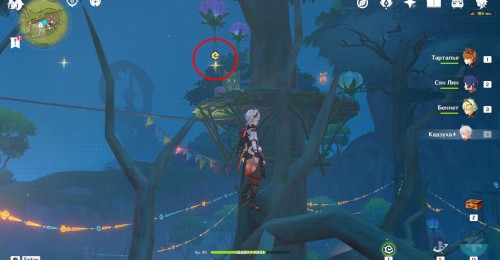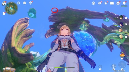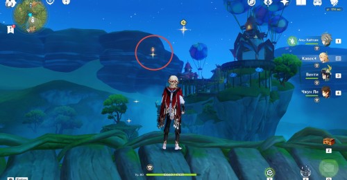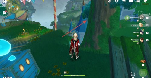 Пройдите к небольшой кольцевой развязке, расположенной в западной части городка и взаимодействуйте со стоящей неподалеку Капелькой. Она создаст клевер, на который нужно воздействовать Анемо атакой для создания воздушного потока, с помощью которого вы сможете добраться до мешочка, висящего наверху.