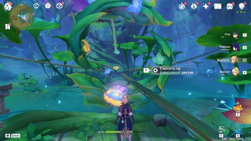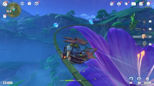 Сядьте в транспорт и двигайтесь к пещере. Если вы еще не построили здесь рельсы, то добравшись до гигантского цветка, взаимодействуйте с Гидро эйдолоном, посмотрите ролик, смените курс и езжайте назад. По пути соберите 3 водяные сферы для создания пути на другие рельсы. Проезжайте по ним вниз до первой остановки, слезьте, снова поменяйте курс и направляйтесь назад.
