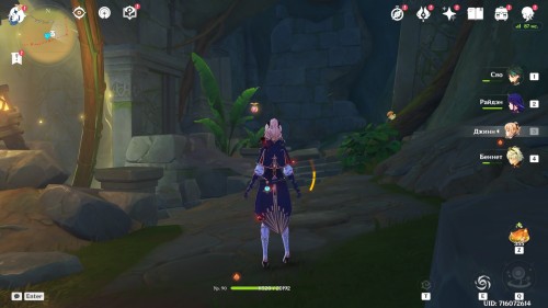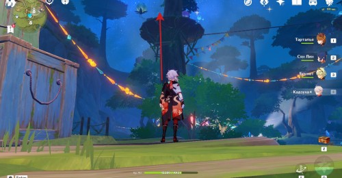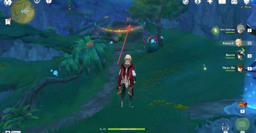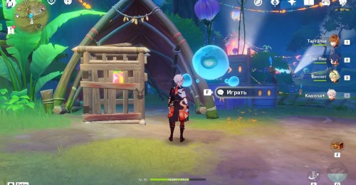 Вернитесь к телепорту и по восточной дорожке выйдите обратно на праздничную площадку. На первой же развилке поверните налево и подойдите к мешочку, запертому в клетке. Чтобы открыть ее, вам будет необходимо поиграть с зависшим рядом Гидро эйдолоном. Возьмите лучника, чтобы пройти предложенное вам испытание меткости и освободить нужный вам шарик.