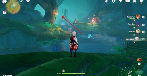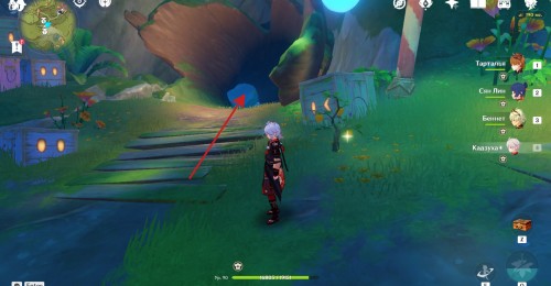 От точки быстрого перемещения направляйтесь на восток. Идите по дорожке, пока справа от вас не появится Гидро эйдолон и полый ствол дерева. Пройдите сквозь него, подойдите к началу моста, а потом развернитесь на 180 градусов. Вам будет необходимо подняться по деревянной лестнице на площадку, где находится лавачурл с каменным панцирем. За ним на уровень выше висит мешочек.