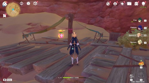 Снова возвратитесь к развилке рельсовых путей, выберите фиолетовый цветок (если он не выбран) и двигайтесь в сторону пустыни. По пути подберите 3 водяных пузыря, чтобы открыть дорогу в пустынную область. Подробнее об этом мы рассказали в квесте «Память о звездной ночи». Добравшись до остановки, пройдите немного вперед и подберите мешочек под тентом.