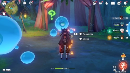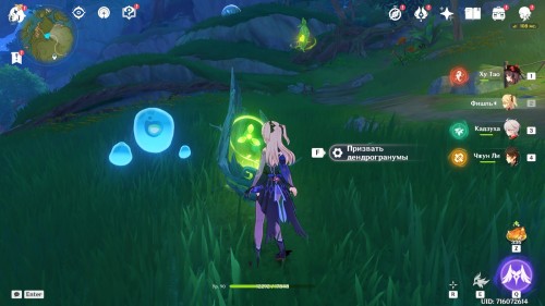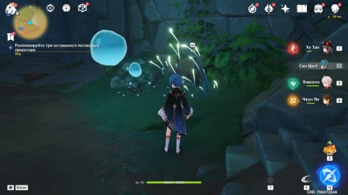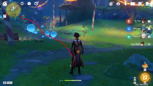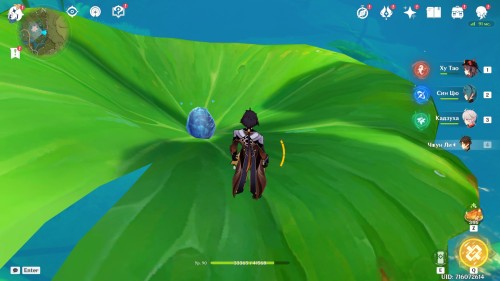 От предыдущего шара пройдите на север и спрыгните вниз к водоему. Здесь вы обнаружите Дендро мины, однако только одна из них будет окрашена в синий цвет – взаимодействуйте с ней, а потом последуйте за капелькой к обычному сундуку.