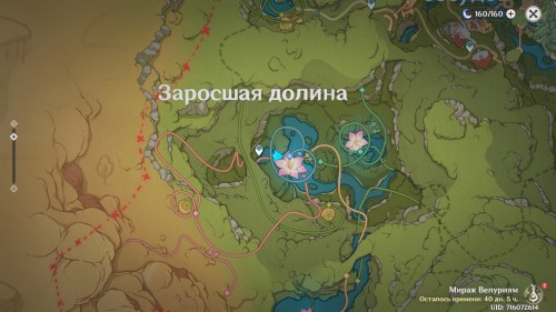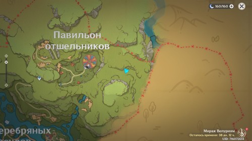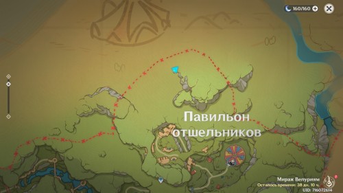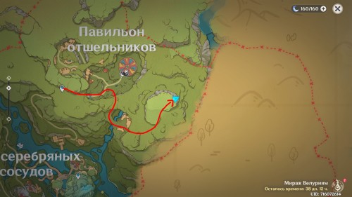 Возвратитесь к рельсовой развязке, выберите фиолетовый цветок, сядьте на таратайку и двигайтесь к первой остановке в пустыне (весь маршрут показан на карте). Слезьте на ней, и вы увидите внутри домика заблокированный обычный сундук. Чуть впереди возле камня будет парить Гидро эйдолон – подойдите к нему и сопроводите его до сундучка.