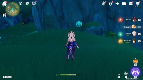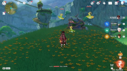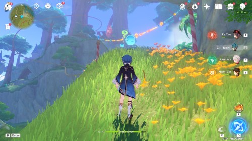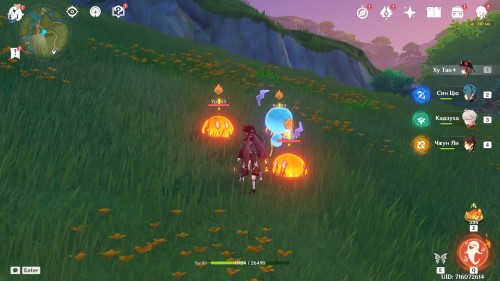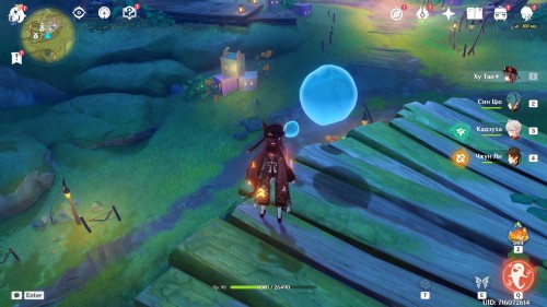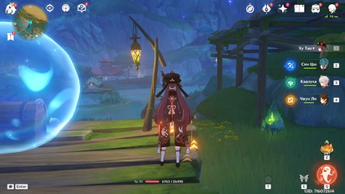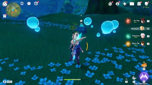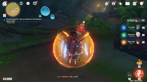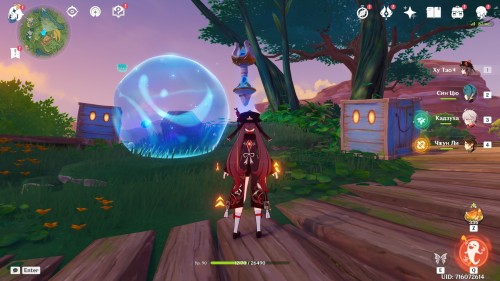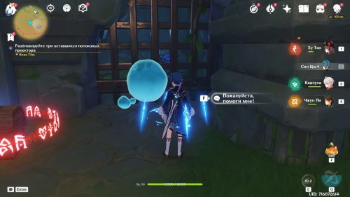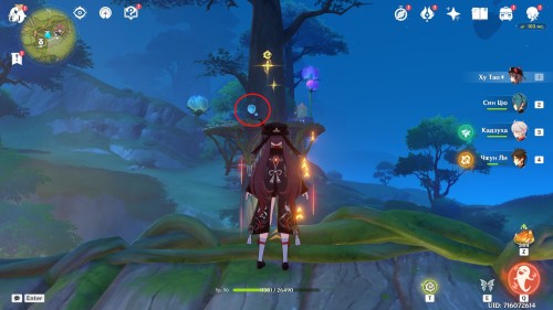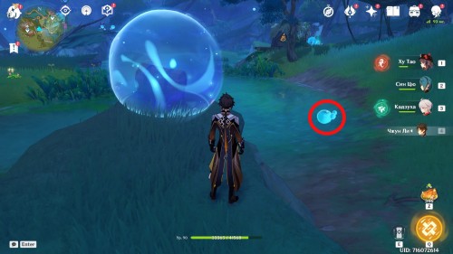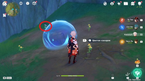 От предыдущего шара пройдите на юго-запад и поднимитесь на выступ. Там у подножья горы вы увидите обычный сундук за синим барьером. Взаимодействуйте с подозрительным фиолетовым цветком, чтобы появился Гидро эйдолон. Затем попросите его о помощи, и он уберет сферу. Отметим, что при попытке вырвать другие цветы на вас будут набрасываться попрыгуньи.