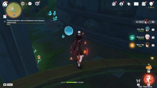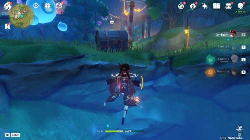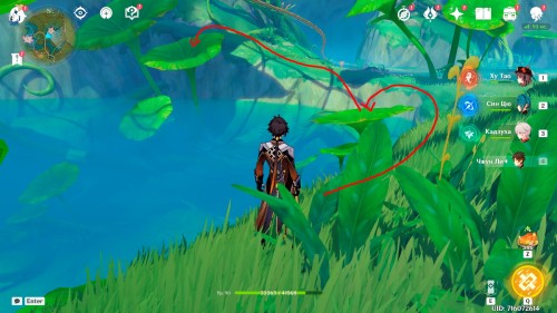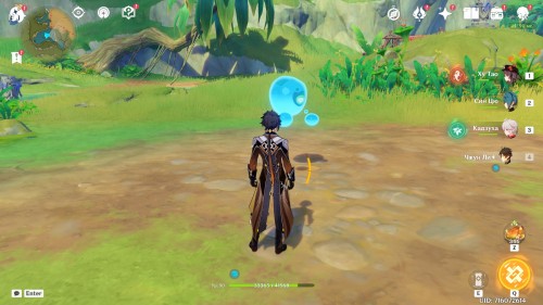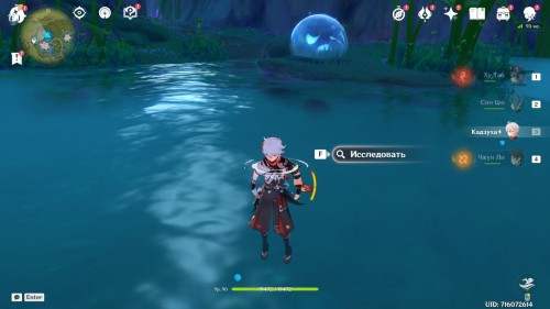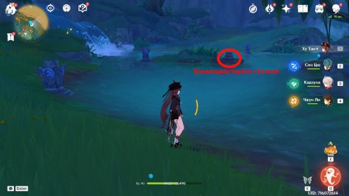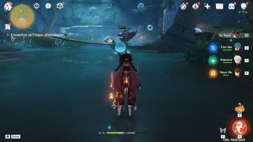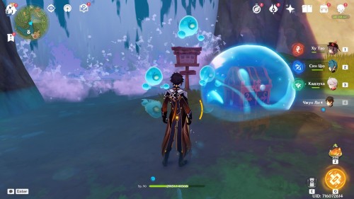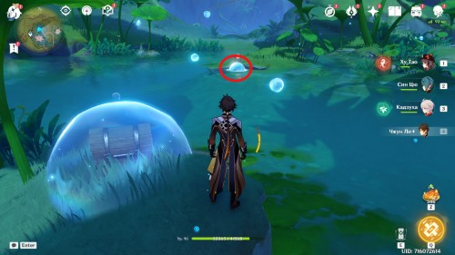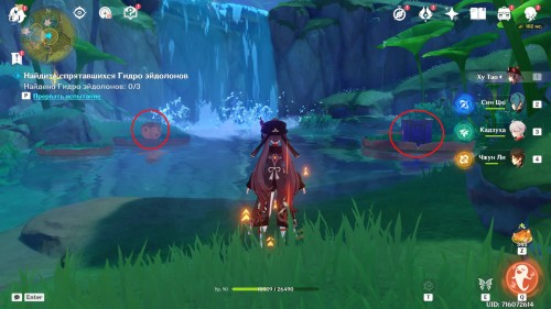 Переместитесь к западному телепорту в указанной области, а потом пройдите на восток. В водоеме рядом с хиличурлом вы заметите пузыри. Подойдите к ним и начните следовать за пузырьками, пока не доплывете до зоны, которую можно исследовать. В итоге появится Гидро эйдолон, который уберет барьер с обычного сундука.