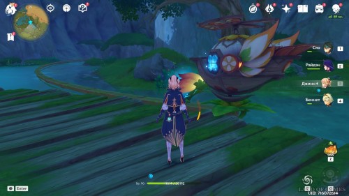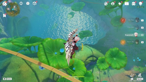Вернитесь к развязке рельсов, выберите бирюзовый цветок и сядьте в таратайку. Когда окажитесь неподалеку от места, показанного на скриншотах ниже, спрыгните с транспорта и спланируйте вниз к драгоценному сундуку, спрятанному под синим барьером. Здесь вам предстоит сыграть в прятки с Гидро эйдолонами.