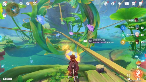 Отправляйтесь к рельсовой развязке и выберите бирюзовый цветок. Сядьте в таратайку и двигайтесь наверх. Затем спрыгните с транспорта в указанном месте и приземлитесь на зеленую кувшинку, на которой расположен Гидро эйдолон. Приблизьтесь к нему, и он переместится на другое растение. Заберитесь на него и взаимодействуйте с бочкой.