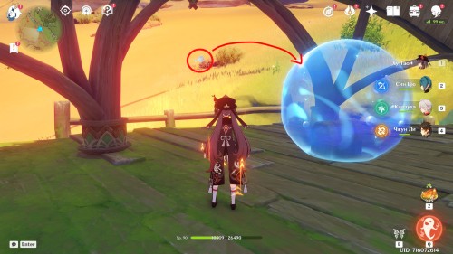 На официальной карте в этом месте показано два Гидро эйдолона, однако оба связаны с одной головоломкой, поэтому мы указали их как один водяной шар. Итак, отправляйтесь на площадку к югу от телепорта, а потом взаимодействуйте с бочкой и цветочным кустом, которые показаны на картинках ниже.