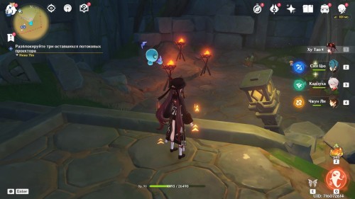 Пройдите в проход слева от фрески в пещере и спуститесь вниз. Здесь вы обнаружите капельку в окружении факелов. Потушите жаровни Гидро атаками, а затем последуйте за эйдолоном до обычного сундука.