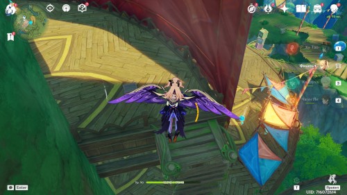 Переместитесь к телепорту в центре области, а затем бегите на площадку со зданием театра, идите на юг и спрыгните с платформы. Начните планировать в сторону другого утеса с сооружениями на юге. Воспользуйтесь четырехлистными символами, чтобы добраться до него.