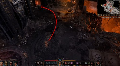 От телепортационной точки бегите на юг по лесенке, пока не дойдете до мертвых тел темных юстициаров. Затем сверните влево, и вы увидите, как несколько двергаров пробуют с помощью роте расчистить каменный завал (Х: -661; Y: 443).