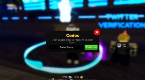 - Встаньте в синий круг и подождите, пока не появится окошко с текстовым полем. Введите туда один из вышеуказанных промокодов и нажмите на кнопку «Redeem».