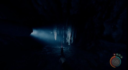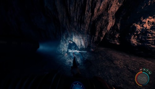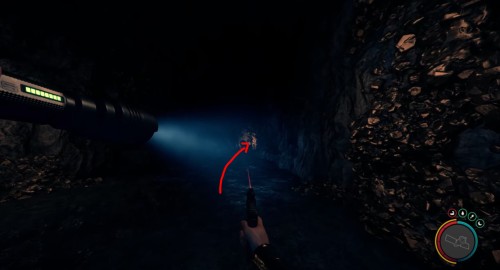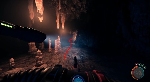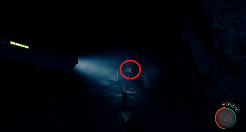Вы дойдете до развилки с двумя проходами, из которых исходит яркое свечение. Вам нужно будет пойти вправо, где с потолка свисают сталактиты. Пройдите мимо черепа, подвешенного к потолку. Впереди и справа на стене вы увидите еще один череп со свечой. Чуть дальше лежит труп оперативника, прислоненный к стенке. В руках он будет держать винтовку. Не забудьте также подобрать коробку с патронами.