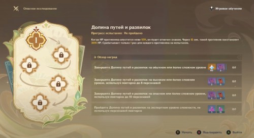 На скриншотах ниже демонстрируются основные сведения об этапе: особенностях уровня, врагах и так далее. Если вы уверены в своих силах, то сразу же выберите Экспертную сложность, чтобы сразу же получить все награды и не перепроходить это испытание несколько раз. Старайтесь не использовать персонажей повторно, так как это влияет на вознаграждение.