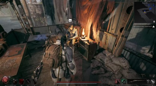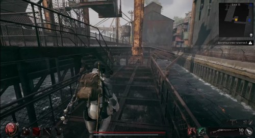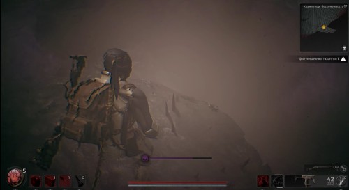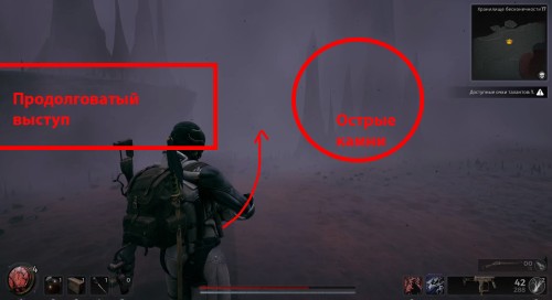 Далее вам нужно будет пройти мимо этих острых камней и выступа вперед, оказавшись в плотном тумане. Вашего персонажа сразу же начнет тошнить из-за отравления. Разбегитесь и прыгните на другой уступ. Там вы обнаружите труп, с которого можно забрать нагрудник Инженера.