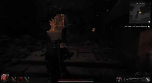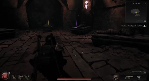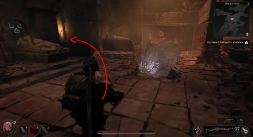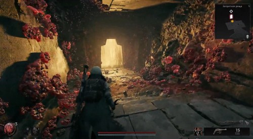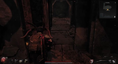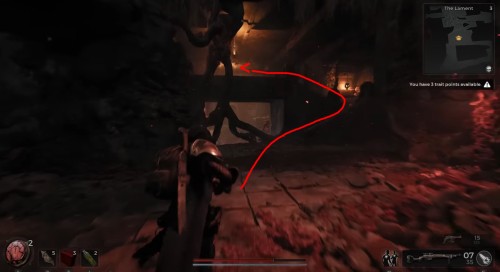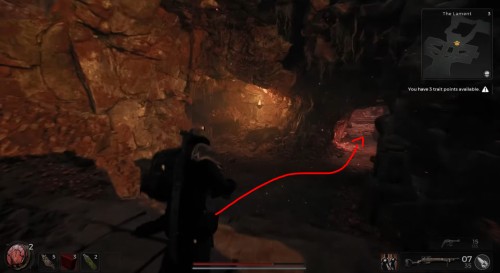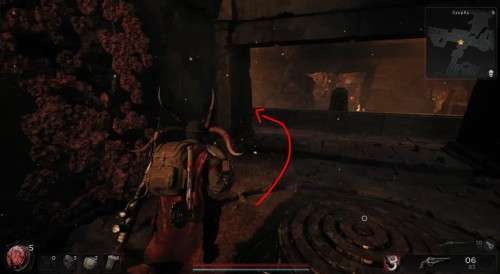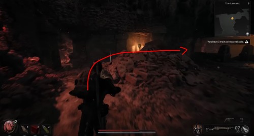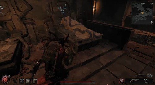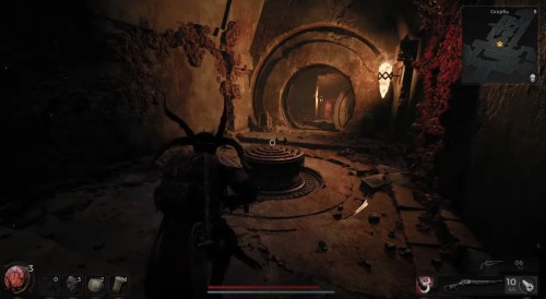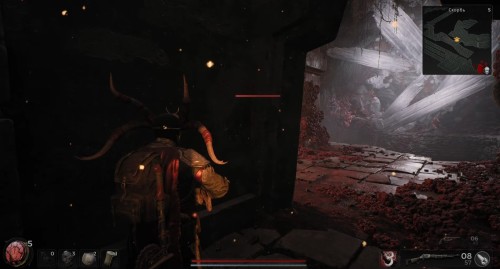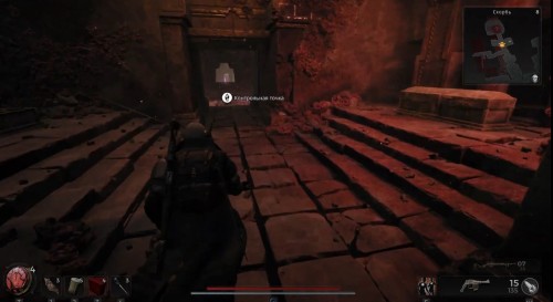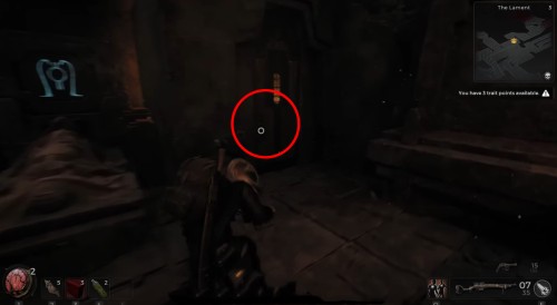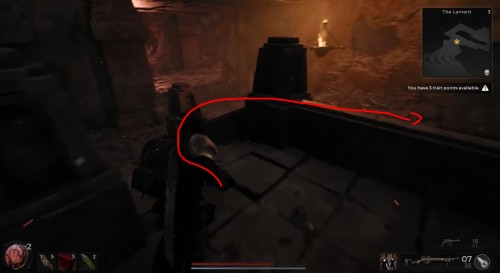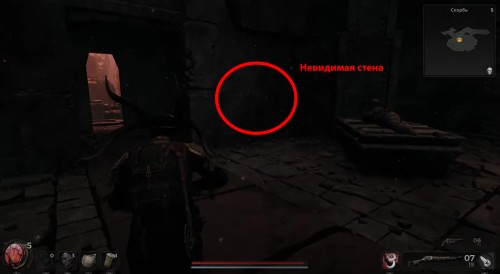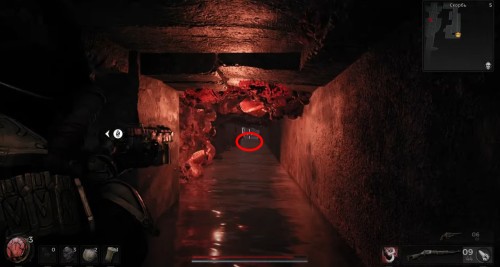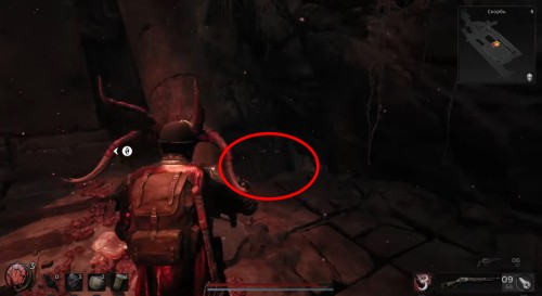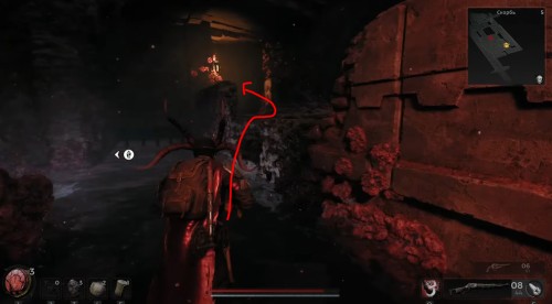 Спуститесь вниз по лесенке вниз до небольшой комнатки впереди с контрольной точкой и отдохните возле нее. Чуть дальше вы можете найти Окровавленное кольцо, которое восстанавливает 2 единицы здоровья в секунду, если вы находитесь не далее чем в 10 метров от существа с кровотечением.