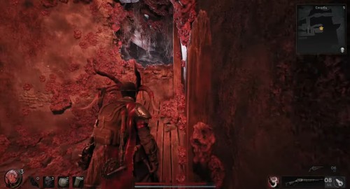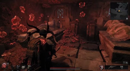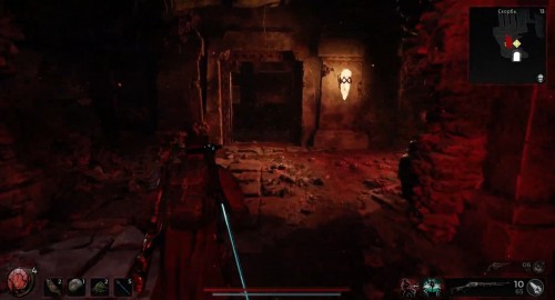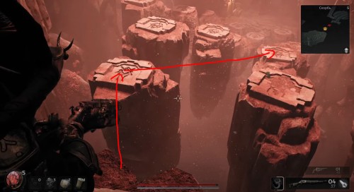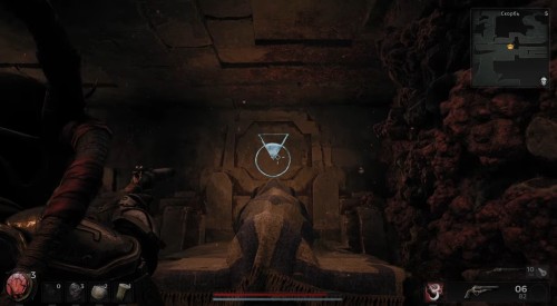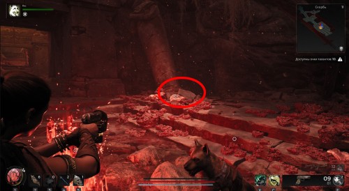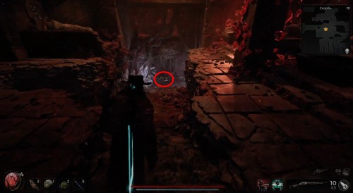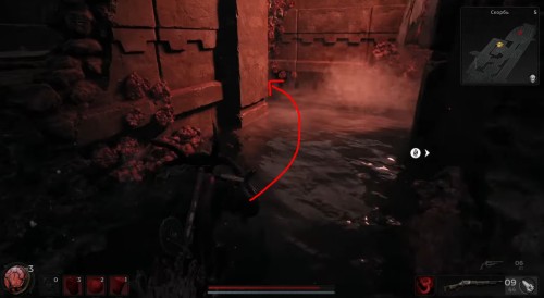 Обойдите кучу камней и сверните вправо. Спуститесь по лестнице вниз и снова поверните направо. Пройдите через отверстие в стене, и вы попадете в просторное помещение. Поднимитесь по ступенькам, пройдя мимо статуй, и войдите в красноватый туннель справа.