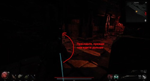 Проход вперед будет закрыт прутьями, поэтому сверните вправо. Прежде чем войти в следующий коридор, вам нужно будет подловить момент, чтобы не попасть под выстрел. Пройдите пару метров, переходя от одной стенки к другой, а потом уже можете не бояться прилета стрел, так как они не попадут в вас, если вы будете идти пригнувшись (возможно, баг).