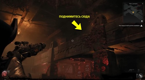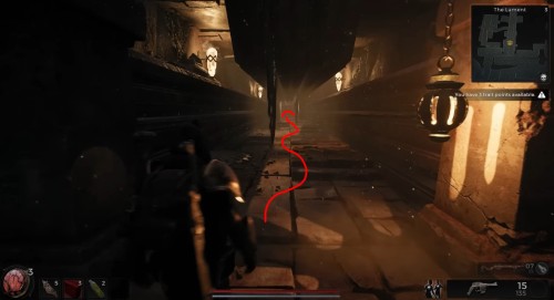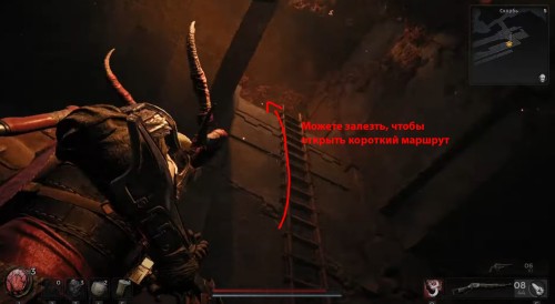 Теперь вернитесь немного назад, сразу же заберитесь на выступ и поверните в левый коридор. Не доходя до его конца, вы увидите деревянную лесенку – можете залезть на нее, чтобы разблокировать короткий маршрут к контрольной точке. Спуститесь назад и бегите до конца коридора, пока не увидите дверь, которую можно открыть найденным ранее ключиком.